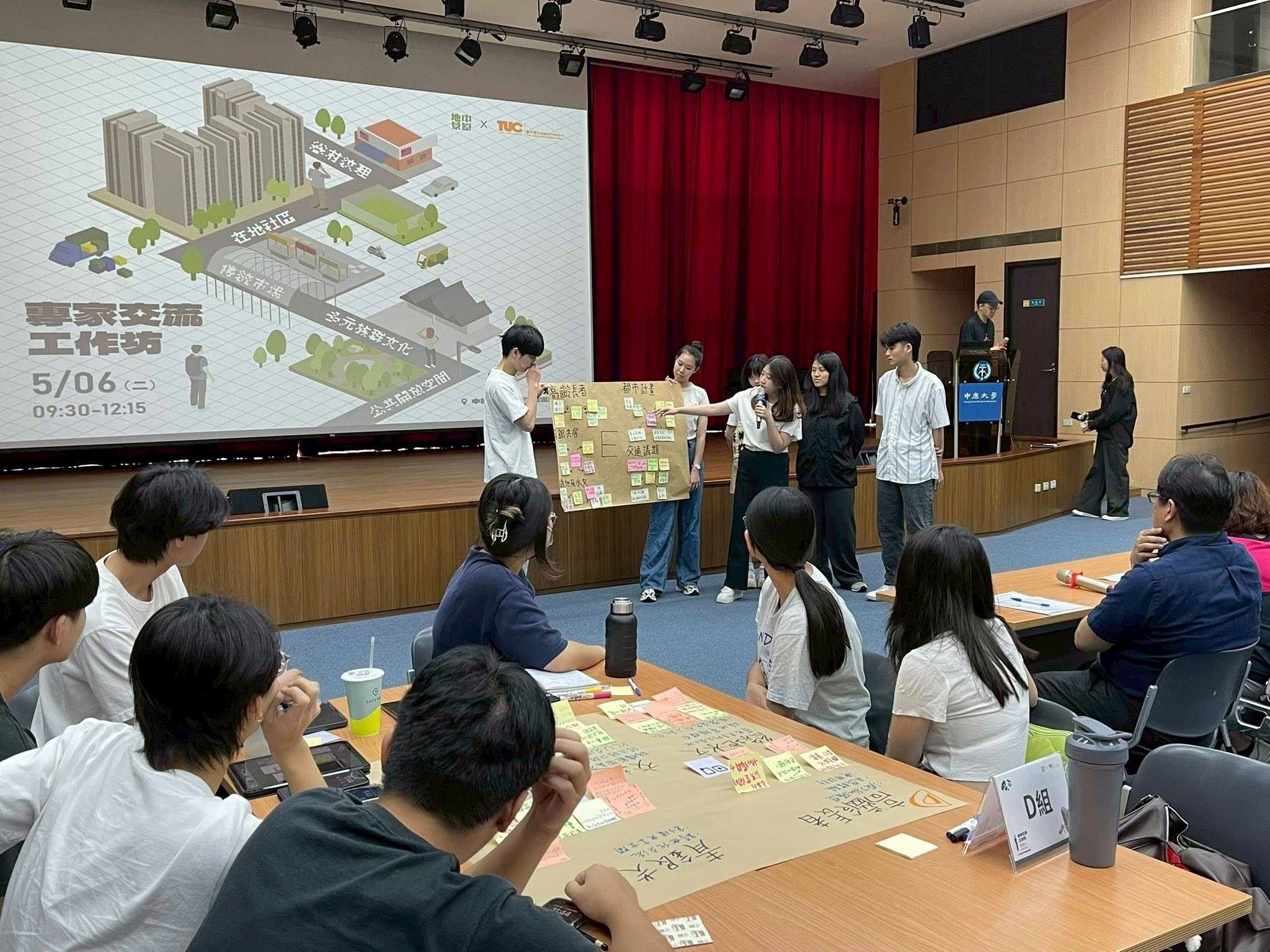 課程實踐上,團隊將大三必修「環境規劃與設計」課程與桃園市政府「龍岡異域軍區都市風貌形塑規劃」案結合,並邀請美國普瑞特藝術學院教授協同教學與全英語評圖,引入國際視野。同時創新辦理「知識市集」與「專家交流工作坊」等活動,串聯16家NGO、公部門與企業代表,讓學生以「跑攤」形式與都發局、經發局、交通局及在地社團對話,提出捷運導向發展(TOD)、綠地系統與人本共享市場等構想。最終20餘組提案獲市府參考採納,成為都市發展的重要建議。