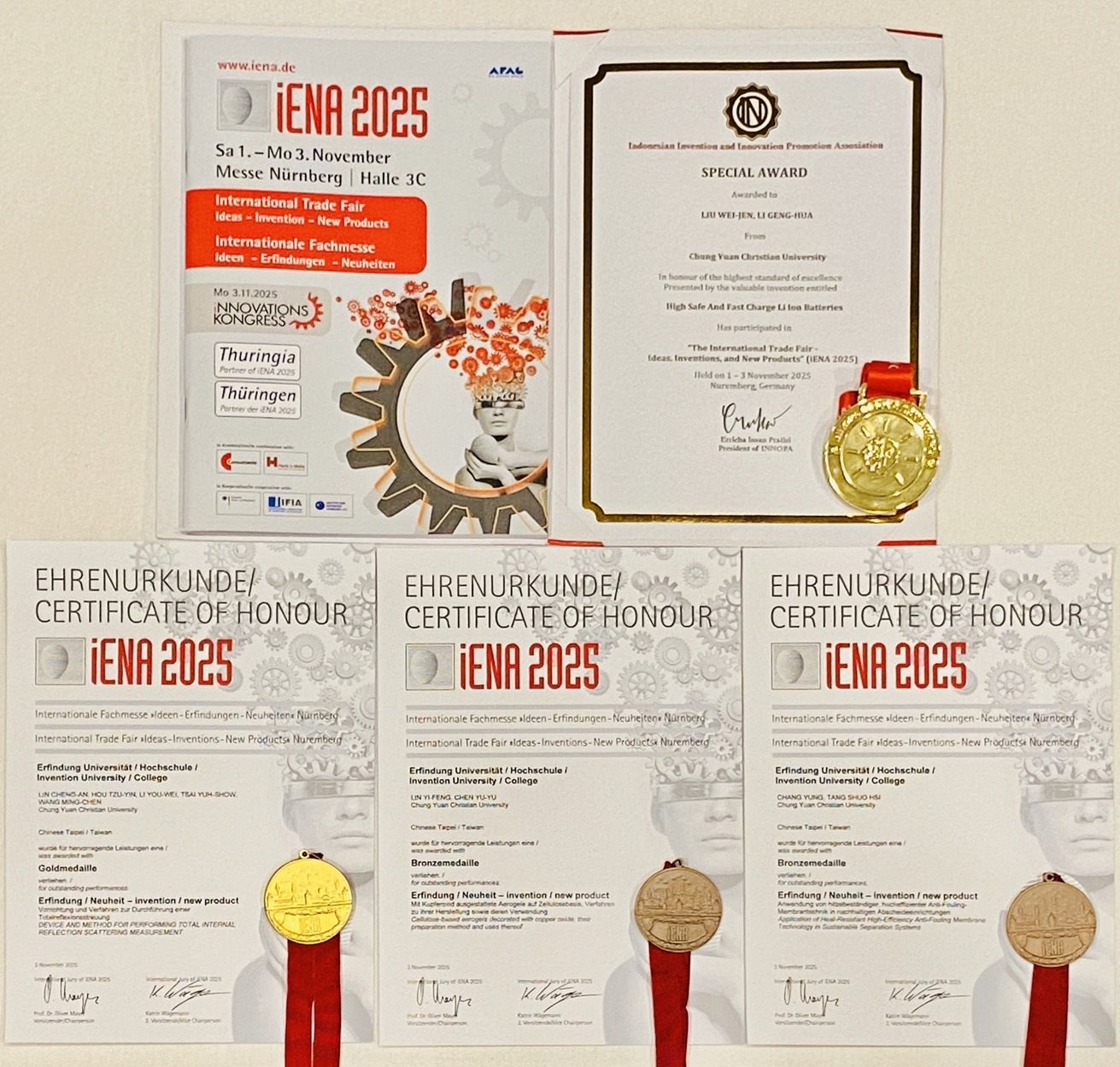 2025年「德國紐倫堡國際發明展」日前圓滿落幕,本校以四組創新研發團隊參展,成果表現亮眼,再度在國際舞台展現研發實力。醫工系林政鞍教授榮獲金牌,化工系林義峯教授及張雍教授分別獲得銅牌,化工系劉偉仁教授則獲印尼發明與創新促進協會(INNOPA)頒發「最佳創新獎(特別獎)」。