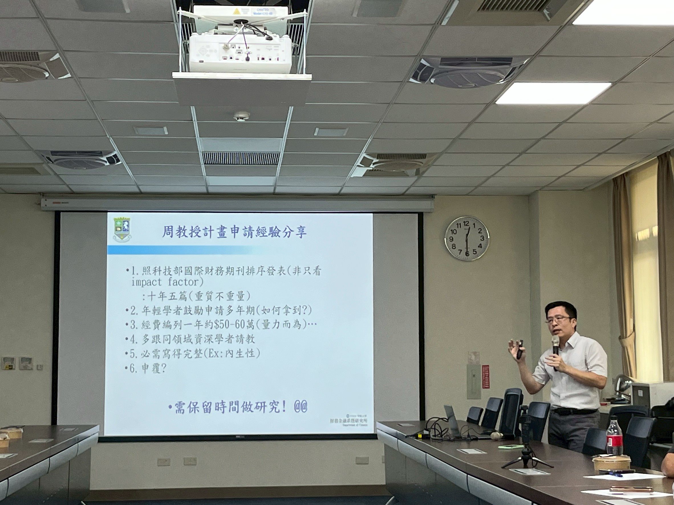 10月14日財金系陳佑倫教授分享主題為「國科會研究與出國計畫申請經驗分享」,分享校外諮議委員周教授申請國科會計畫的經驗,建議年輕學者可優先考慮申請多年期計畫,並依個人執行計畫能力編列一年約50-60萬經費,同時請教相同領域資深學者的申請經驗,以提升計畫的通過率;申請出國計畫推薦申請Fulbright Scholar Program此項補助經費的核銷流程相對比較簡單,同時也建議新進教師對於研發處的各項補助多加注意並加以申請。