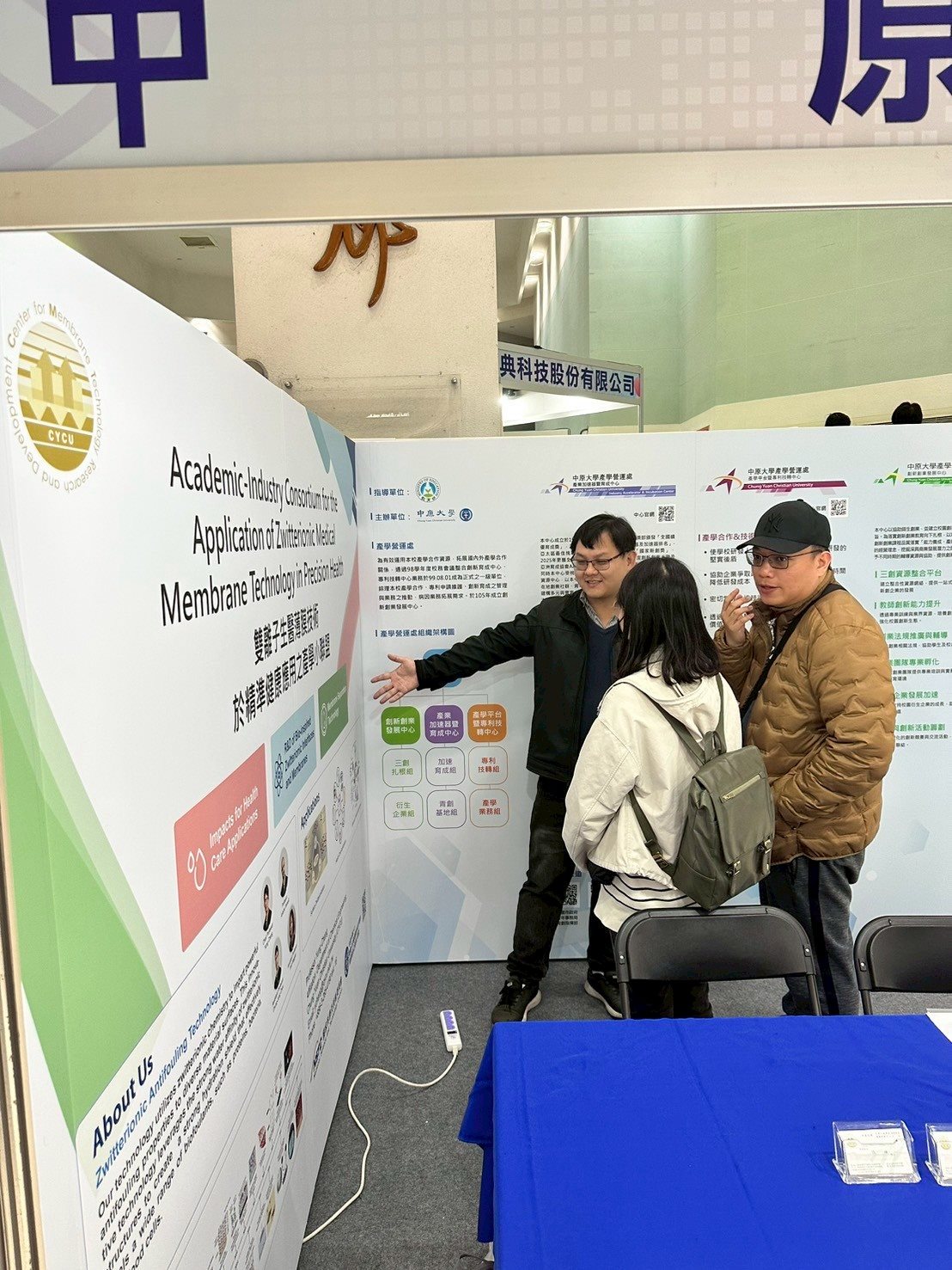 在年會期間,育成中心積極落實校內研發能量與產業端的市場鏈結。在技術推廣方面,展示薄膜中心研發之「雙離子生醫薄膜技術」,並深入剖析該技術在提升生物相容性、抗蛋白質吸附及優化醫材表面性能等關鍵應用優勢,有效提升本校核心技術在精準醫療市場的能見度。同時,育成中心與進駐育成企業「鑠騰生醫科技有限公司」進行實質對接,掌握企業在生醫市場的發展現況,並協助尋求潛在技術合作契機。此次參展不僅掌握醫學與科技整合的關鍵趨勢,更透過與校內團隊及育成廠商的現場互動,具體實踐產學推廣與企業輔導的實務目標。
